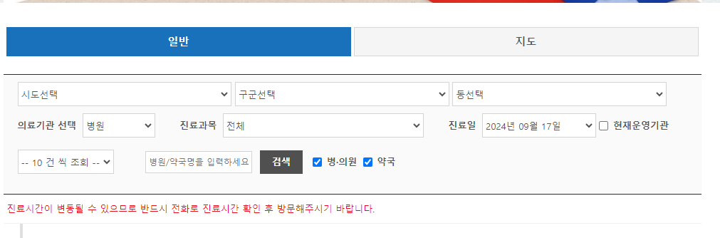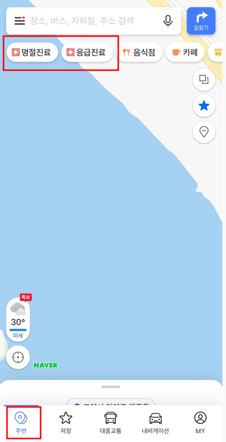 주변 탭의 상단에 보시면 명절진료, 응급진료 병원들 확인이 가능합니다.