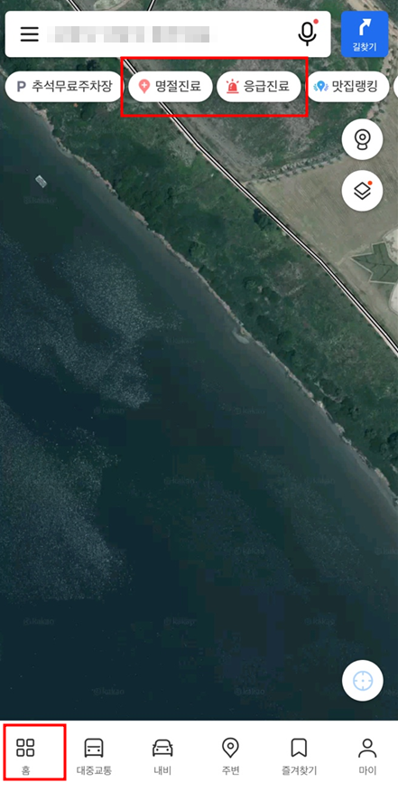 카카오맵에서는 홈으로 들어가 보시면 상단에서 명절진료, 응급진료를 누르시면 진료 가능한 병원들 확인이 가능합니다.