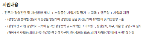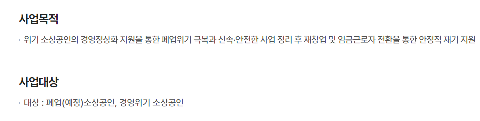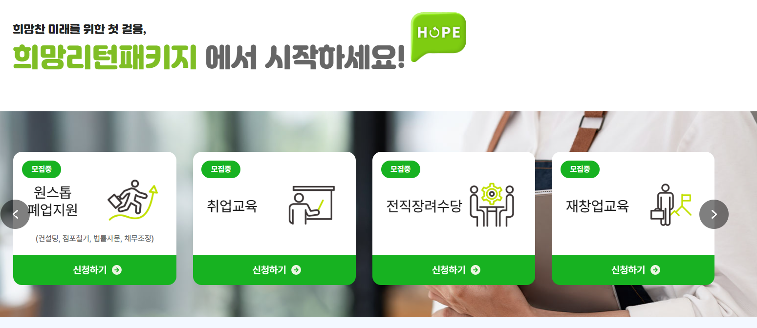 - 경영개선 지원, 원스톱 폐업지원, 재취업지원, 재창업지원