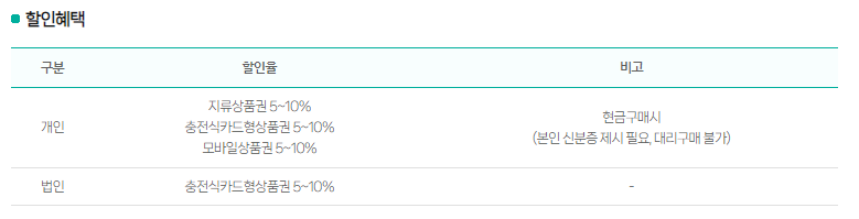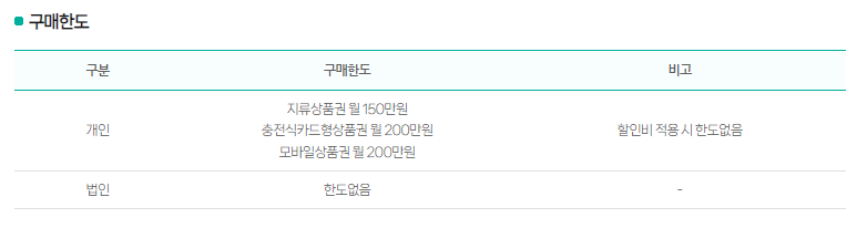 구매한도는 개인이 구매할 때 지류상품권은 월 150만 원, 충전식 카드형과 모바일상품권은 월 200만 원이라고 합니다.
