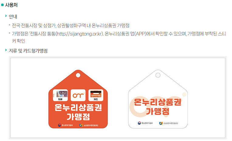 가맹점은 전통시장통통 웹사이트와 온누리상품권 앱에서 확인할 수 있으며 가맹점에 부착된 스티커를 확인하면 된다고 합니다.