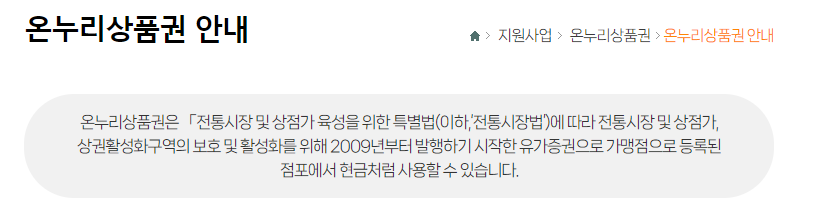 온누리상품권은 위와 같이 전통시장 및 상점가, 상권활성화 구역의 보호 및 활성화를 위해 발행되기 시작한 유가증권으로 가맹점포에서 현금처럼 사용할 수 있다고 합니다.
