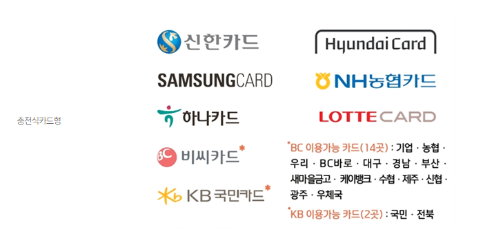 충전식 카드형으로 이용가능한 카드도 위와 같이 잘 정리되어 있습니다.