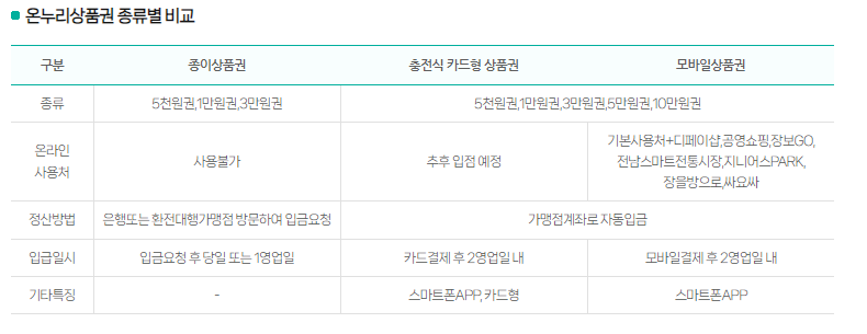 온누리상품권은 종이상품권, 충전식 카드형 상품권, 모바일상품권이 있으며, 종류는 종이상품권은 5천 원권, 1만 원권, 3만 원권이며 카드형 상품권과 모바일상품권은 여기에 추가로 5만 원권, 10만 원권까지 있다고 합니다.