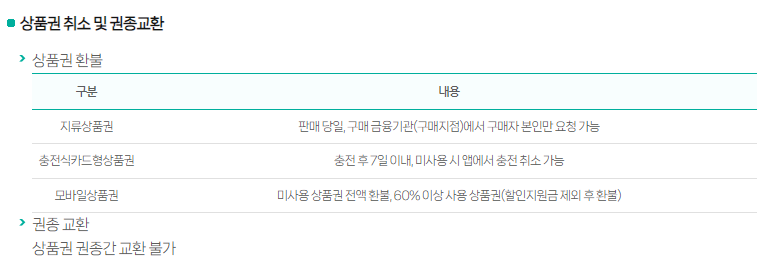상품권 환불은 위와 같이 지류상품권과 충전식, 모바일의 방법이 다르니 잘 확인하셔서 환불받으실 수 있으시면 좋을 것 같습니다.