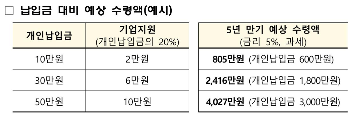 근로자가 매월 10~50만 원을 저축하면 기업이 근로자 납입금의 20%를 추가로 지원하고 협약된 은행에서 금리 우대를 제공합니다. 또한 소득세 감면 등의 혜택까지 주어진다고 합니다.