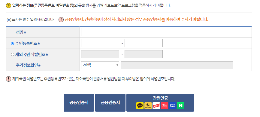 공동인증서, 금융인증서와 간편 인증 모두 사용이 가능해서 가능한 방법으로 인증을 받으시면 됩니다.
