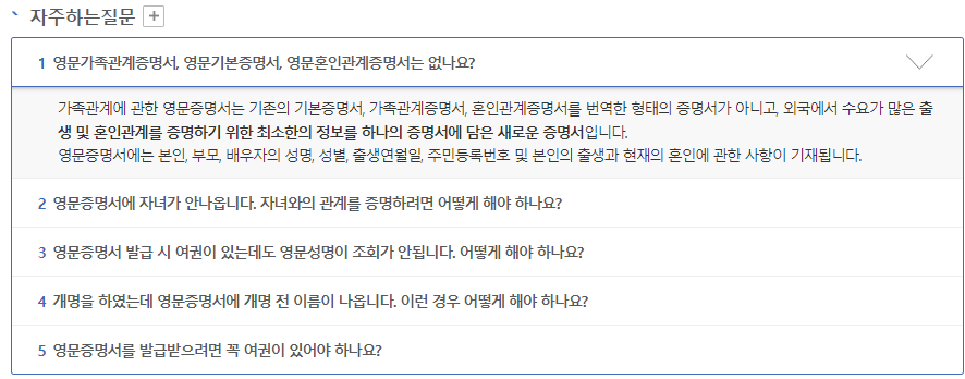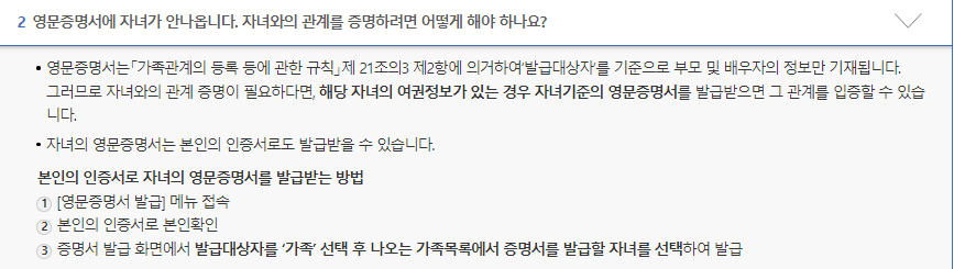 영문증명서 안내 내용에 보면 해당 자녀의 여권정보가 있는 경우 자녀기준의 영문증명서를 발급받으면 그 관계를 입증할 수 있다고 되어 있습니다.