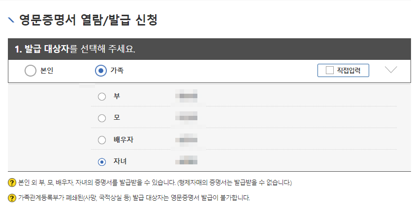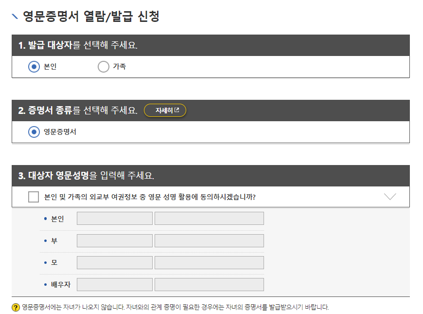 아이와 여행 시 필요할 경우 아이 이름이 나와야 하는데 발급 대상자를 본인으로 하면 아이가 증명서에 나오지 않습니다.