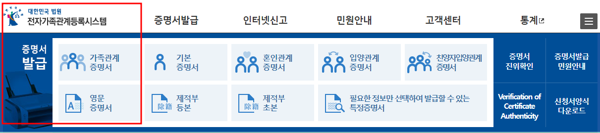 들어가 보시면 위와 같이 사이트가 나오게 되는데 가족관계증명서와 영문증명서라는 항목으로 나와 있습니다.