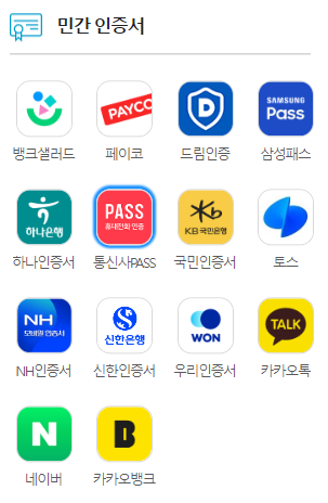 민간 인증서는 위와 같이 나오며 선택해서 인증받을 수 있습니다.