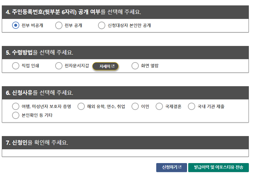 그 외에는 원하시는 대로 선택 후 발급받으실 수 있습니다.