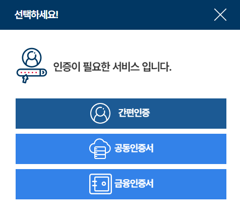 간편 인증을 선택하시면 위와 같이 인증이 가능한 민간 인증서들을 볼 수 있습니다.