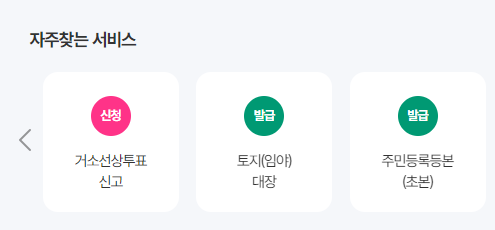 홈페이지에 들어가면 바로 아래 자주찾는 서비스에서 주민등록등본 발급 페이지로 가실 수 있습니다.