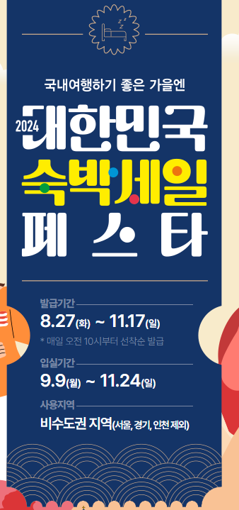 여행을 갈 계획이 없어서 모르고 있었는데 대한민국 숙박세일 페스타는 벌써 8월 27일부터 시작되었다고 합니다.