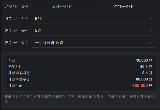 주휴수당 = (40시간÷ 40시간) x 8시간 x 10,000원 = 80,000원