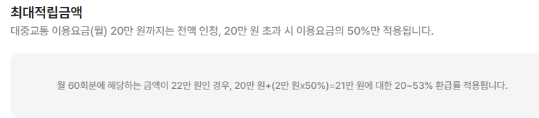 K-패스 최대적립금액은 월 20만 원까지는 전액 인정, 20만 원 초과 시 이용요금의 50%만 적용된다고 합니다.