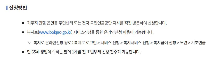 만 65세 생일이 속하는 달의 1개월 전 초일부터 신청, 접수가 가능하다고 되어 있네요.