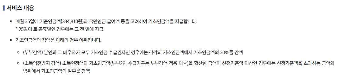 매월 25일에 기준연금액과 국민연금 급여액 등을 고려하여 기초연금액을 지급한다고 합니다.
