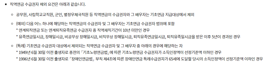 직역연금 수급권자 제외 요건 또한 위와 같이 정리되어 있어 미리 확인해 보시면 좋을 것 같습니다.