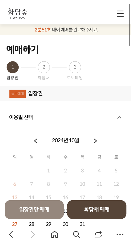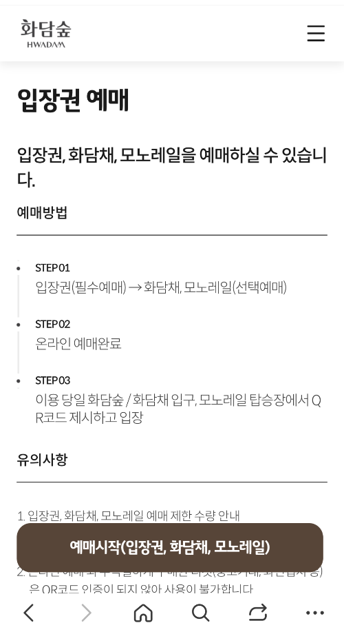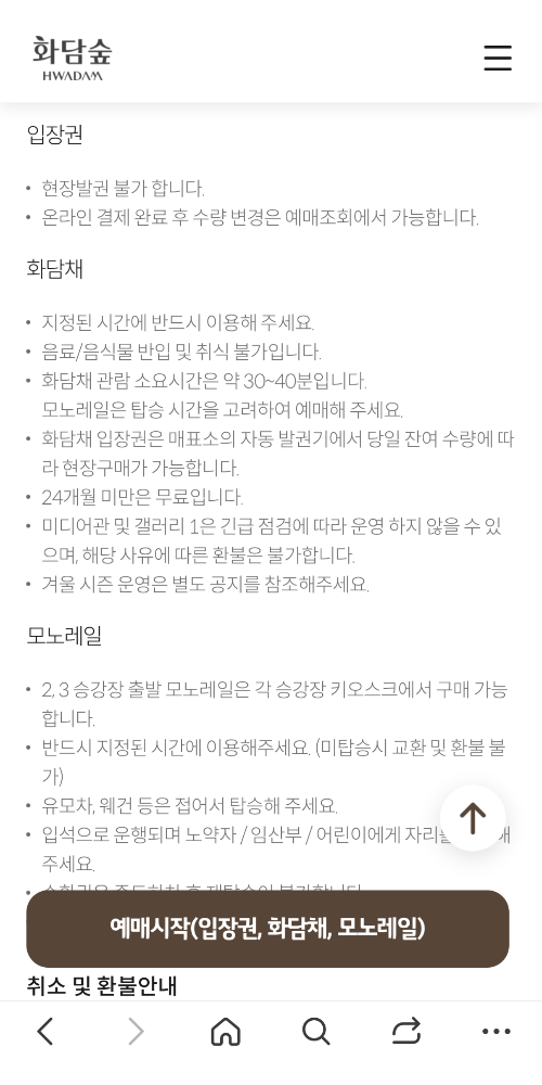 입장권 및 화담채, 모노레일 모두 한 번에 예약이 가능하더라고요~