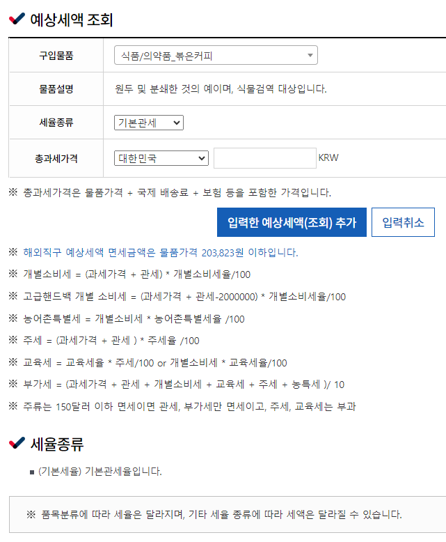 해외직구물품 예상세액 조회