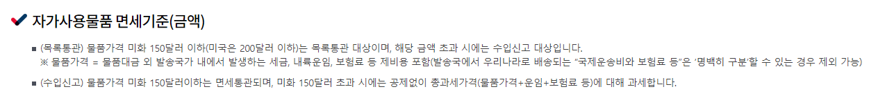 의약품, 한약재, 건강기능식품 등 목록통관 배제대상물품에 해당 시에는 수입신고가 필수이며, 이때는 국가 구분 없이 150달러까지만 관세 등 면세된다고 하니 참고해 주시면 좋을 것 같아요!