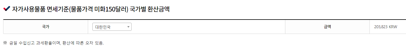 자가사용물품 면세기준 국가별 환산 금액도 미리 확인해 볼 수 있었습니다.