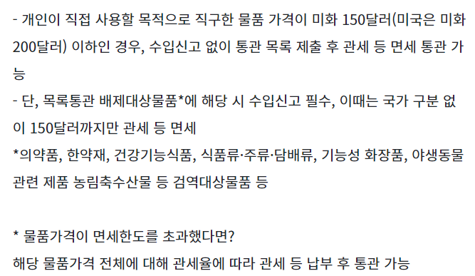 개인이 직접 사용할 목적으로 직구한 물품은 미화 150 달러 이하 (미국은 200달러) 이하인 경우 목록통관 및 면세 통관 가능하다고 합니다.