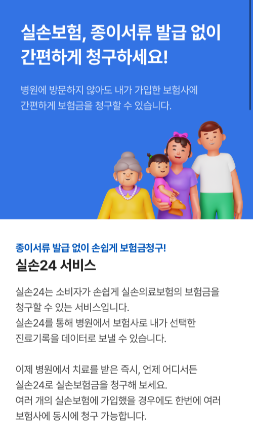 실손 24에서는 본인뿐만이 아니라 나의 자녀, 나의 부모 등 직접 청구서 작성이 어려운 경우를 대신해 작성이 가능해서 더 편리하게 이용이 가능할 것 같습니다.