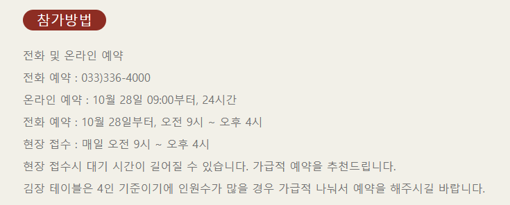 운영기간: 2024년 11월 8일(금요일) ~ 2024년 11월 17일(일요일) 운영시간: 오전 9시~오후5시 (접수 마감: 오후 4시) 참가방법: 전화 및 온라인 예약 - 전화예약: 033)336-4000 - 온라인 예약: 10월 28일 09:00부터 24시간 - 현장 접수: 매일 오전 9시~오후4시 |