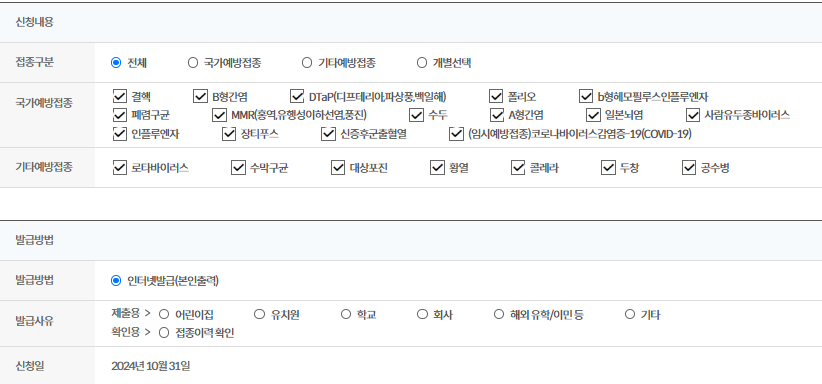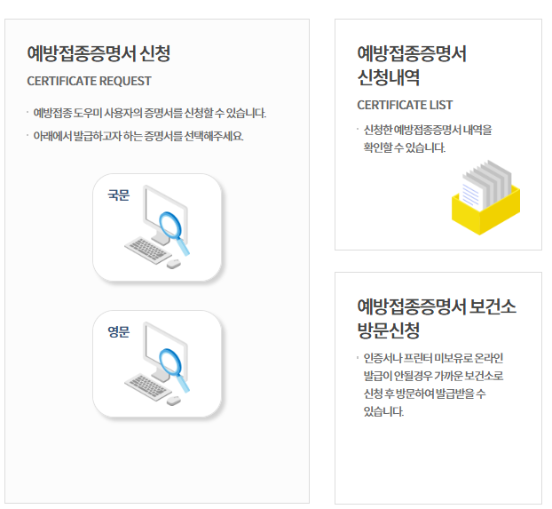 예방접종 증명서 또한 홈페이지에서 바로 발급이 가능합니다.