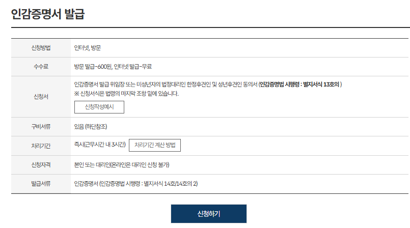 인감증명서 발급 페이지로 가면 아래와 같은 화면이 나옵니다.