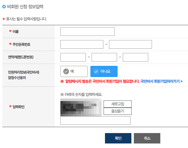 비회원으로 신청하게 되면 위와 같이 신청 정보를 입력하게 되어 있습니다.