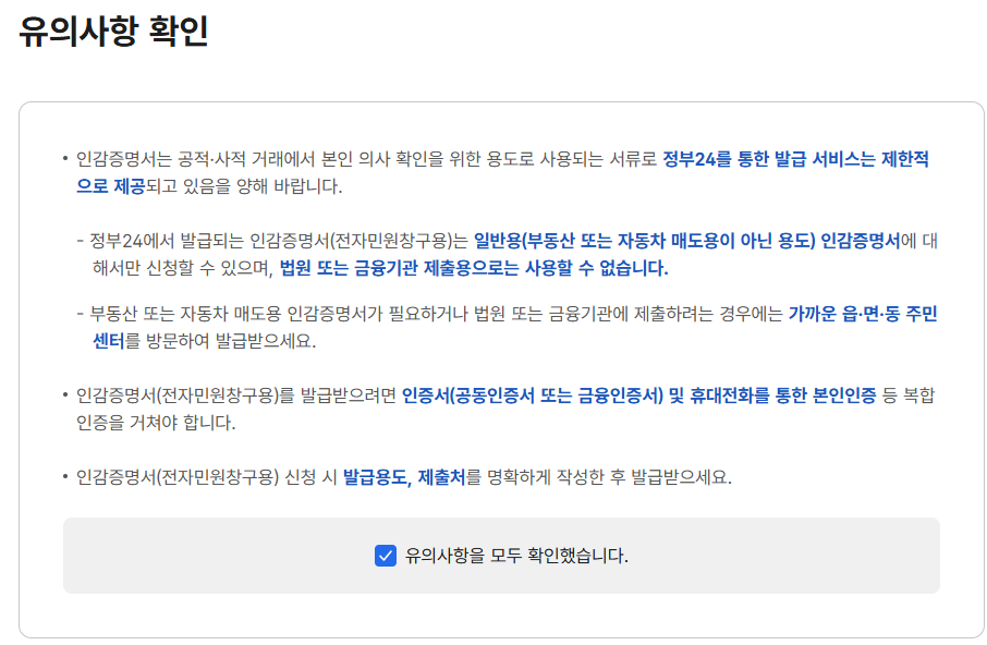 유의사항까지 확인 후 인증까지 진행하고 나면 발급 용도 확인 후 인감증명서를 발급받을 수 있습니다.