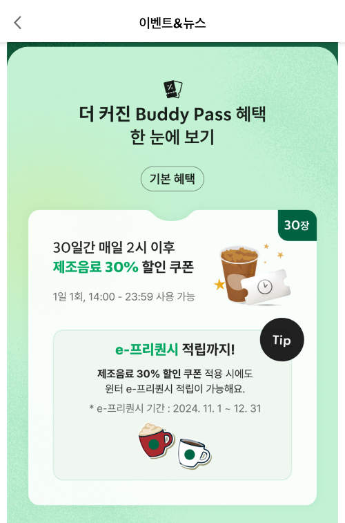 | 1. | 30일간 매일 2시 이후 제조음료 30% 할인쿠폰 | 대상 제조음료 1잔 / 할인 쿠폰 적용해도 e-프리퀀시 적립 가능 당일 14:00~23:59 / 일부 할인 제외 |