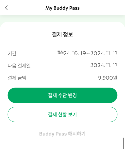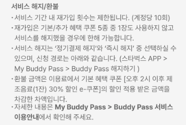 서비스 해지/환불은 APP 첫 화면에 보면 Buddy Pass 버튼을 눌러서 들어가면 결제 정보 아래에 Buddy Pass 해지하기라고 바로 나와 있습니다.