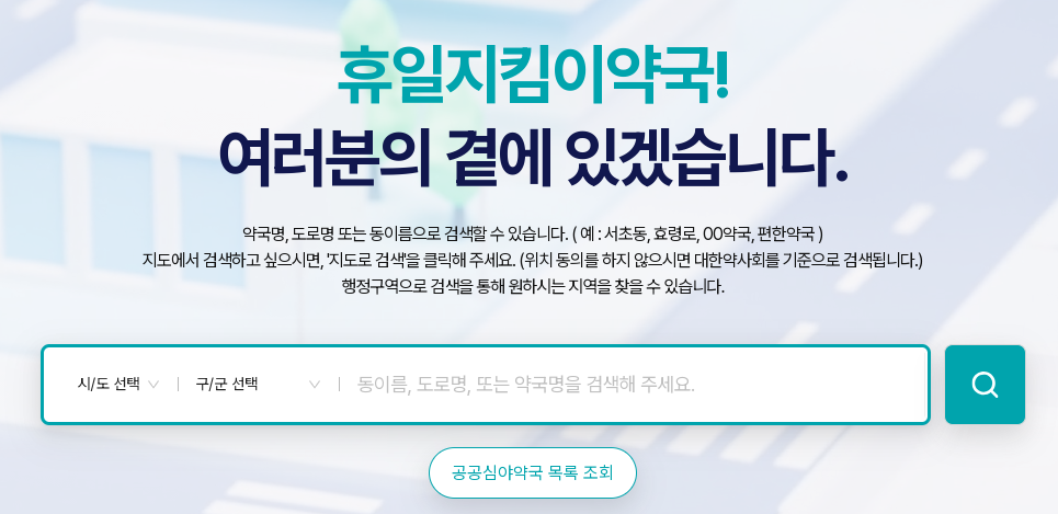 휴일지킴이약국! 여러분곁에 있습니다. 지금 운영 중인 약국부터 심야약국까지! 휴일지킴이약국이 여러분의 건강을 지켜드리겠습니다.