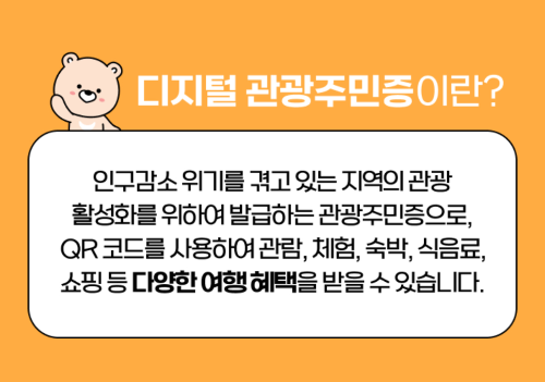 인구소멸 위기를 겪고 있는 지역의 관광활성화를 위한 명예주민증! 디지털 관광 주민증 발급받고, 다채로운 할인 혜택 챙겨서 떠나보세요.