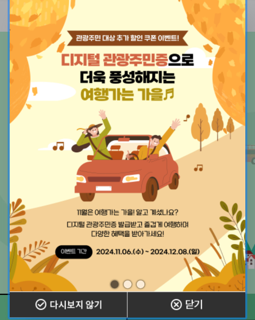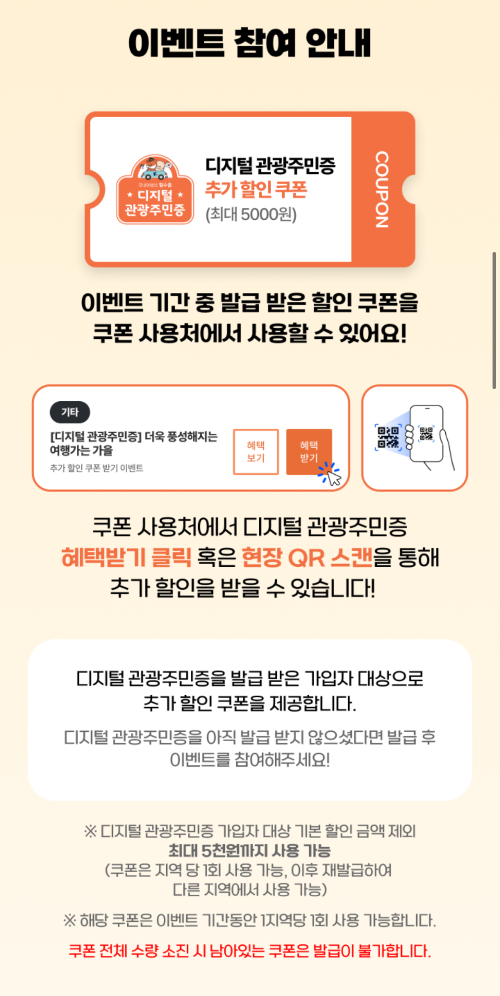 이번에 디지털 관광주민증 블로그 글을 작성하다가 알게 되었는데 2024.11.06~2024.12.08까지 추가 할인을 받을 수 있는 이벤트도 있다고 하니 잘 확인하셔서 참여해 보셨으면 좋겠습니다.